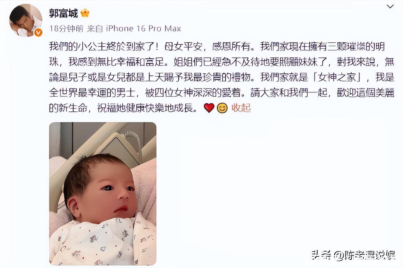 二女儿出生后,郭富城发文官宣三胎女儿出生,称